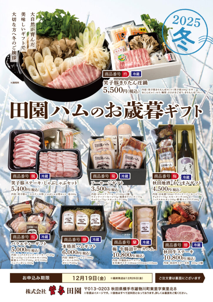 定番商品のハム・ソーセージ系のギフトや例年大人気のきりたんぽセット、笑子豚のステーキ・しゃぶしゃぶセット等となります。